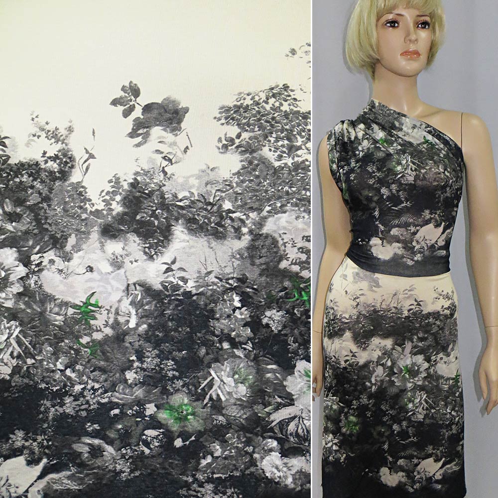 Трикотаж віскозний стрейч кремово-сірий з квітами (рапорт) ш.140. Склад тканини: Віскоза-97, Еластан-3. Щільність тканини 100 г/м.кв. Країна виробник: Німеччина. Трикотаж – це м'яка щільна матерія, не прозора. Приємна на дотик, комфортна в носінні. Завдяки вмісту синтетичних матерій, матеріал більш зносостійкий та надовго зберігає свій первісний вигляд. Тканина відрізняється своєю приємною текстурою, гарною розтяжністю, практично не здається. Трикотаж досить простий у догляді. Використовується для пошиття суконь, спортивних костюмів, легких жакетів, поло, футболок та багато іншого.Дякуємо за ваш вибір.