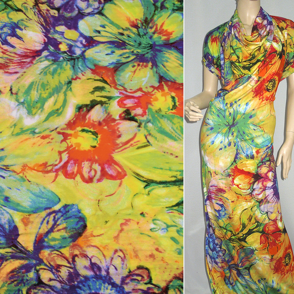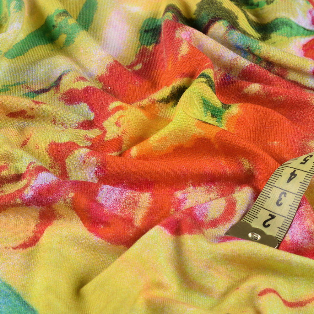 Трикотаж віскозний стрейч в великі помаранчеві, жовті, фіолетові квіти ш.145. Склад тканини: Віскоза-94, Еластан-6. Щільність тканини 212 г/м.кв. Країна виробник: Німеччина. Трикотаж – це м'яка щільна матерія, не прозора. Приємна на дотик, комфортна в носінні. Завдяки вмісту синтетичних матерій, матеріал більш зносостійкий та надовго зберігає свій первісний вигляд. Тканина відрізняється своєю приємною текстурою, гарною розтяжністю, практично не здається. Трикотаж досить простий у догляді. Використовується для пошиття суконь, спортивних костюмів, легких жакетів, поло, футболок та багато іншого.Дякуємо за ваш вибір.